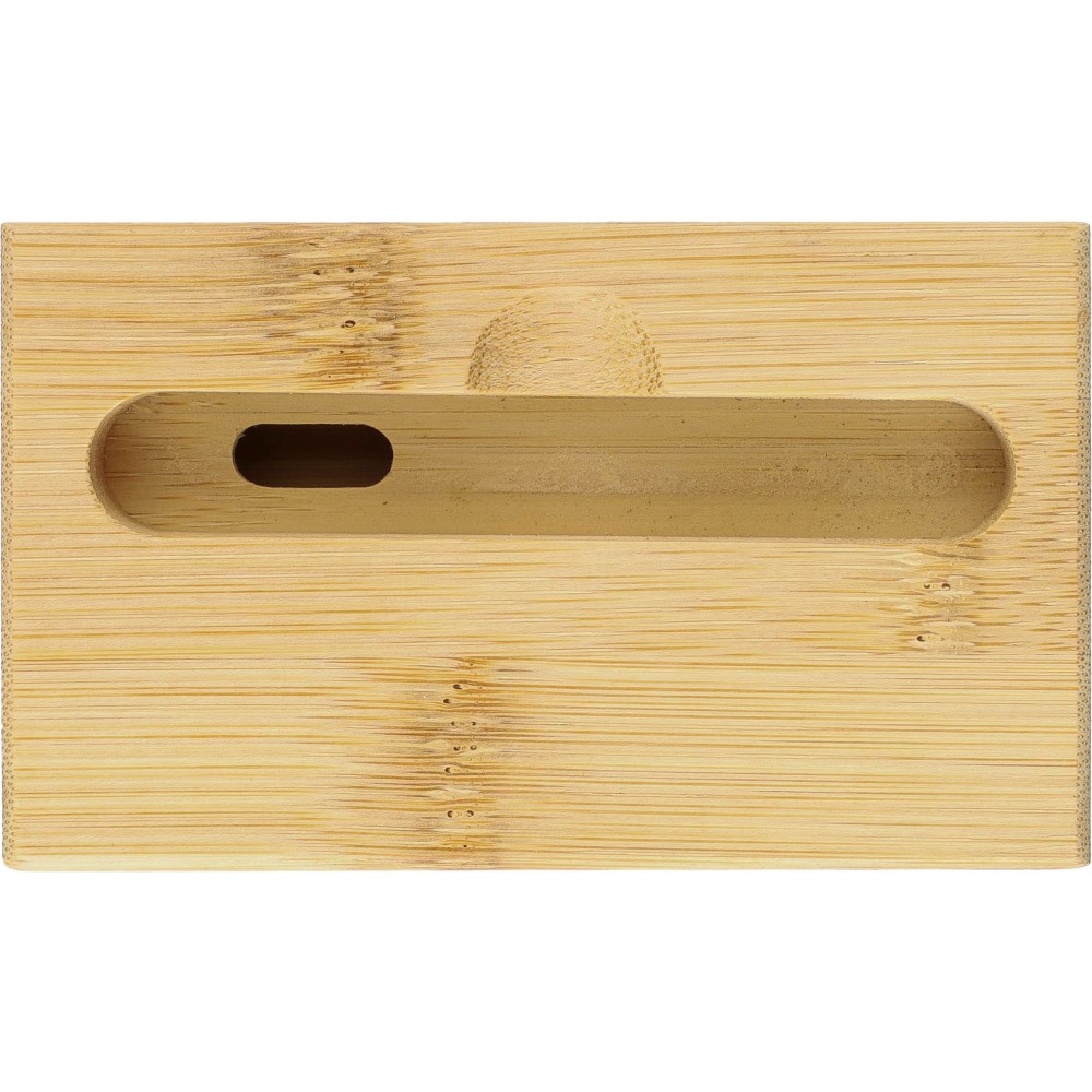 Bambusz telefontartó hangszóró funkcióval. Zenelejátszás közben az alsó részen keresztül erősíti a hangot áram vagy elem használata nélkül. Telefontartó nyílás méretei: kb. 8,2 x 1,2 cm. Egyenként barna kartondobozba csomagolva.