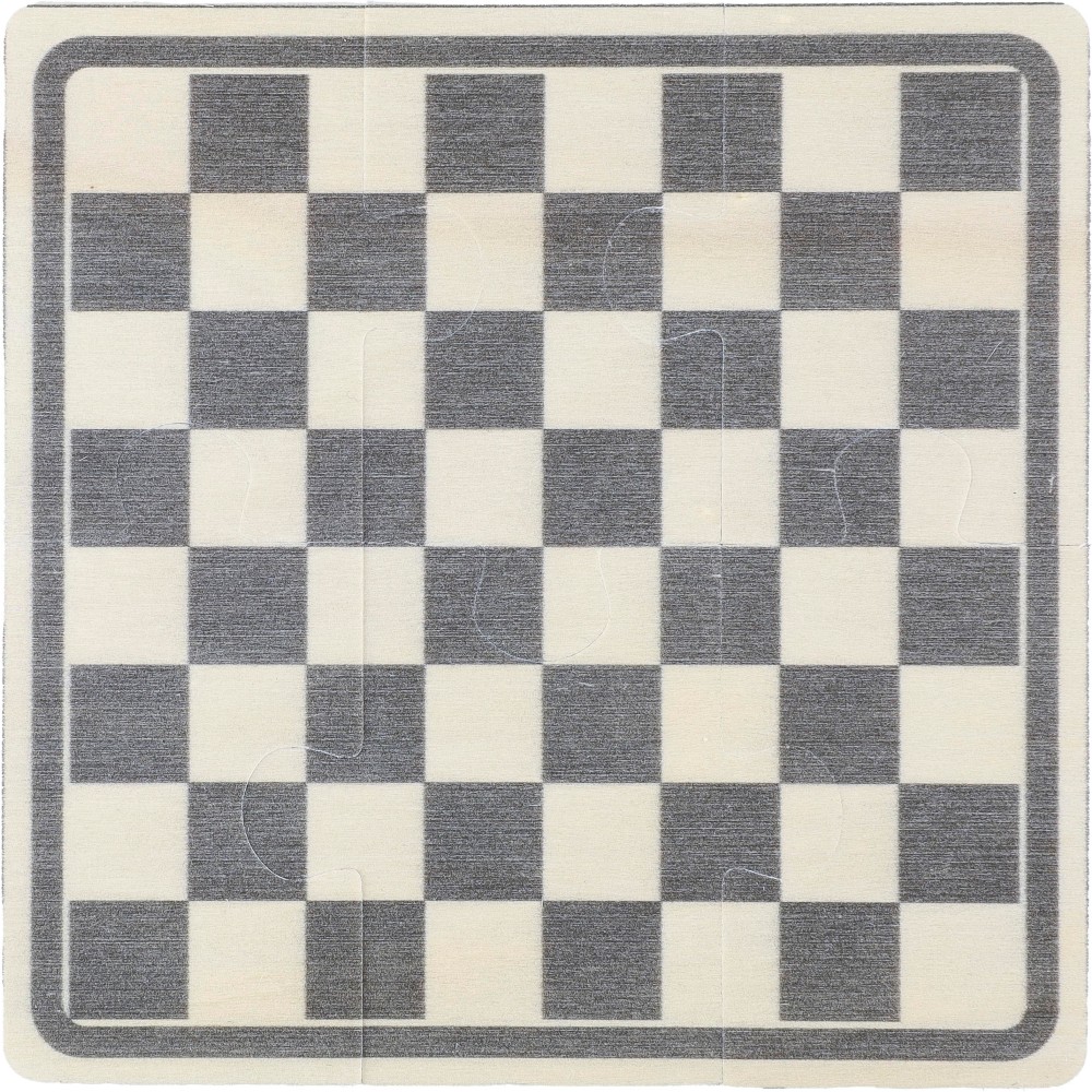 Fa sakk- és dámajáték pamut zsinóros tasakban. Tartalmaz egy 6 darabból álló, nyomtatott puzzle-t, amely összerakható a játéktábla létrehozásához, valamint 16 nyomtatott fa zsetont, amelyek sakkfigurákat ábrázolnak. A játéktér anyaga rétegelt lemez, a zsetonok anyaga fenyőfa.