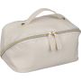 Újrahasznosított PU anyagból készült neszesszer középen elhelyezett cipzárral a széles nyithatóság érdekében. Rövid fogantyúval, tágas belső térrel és négy rekesszel, beleértve egy belső cipzáras zsebet. 210D újrahasznosított béléssel készült, belsejében egy újrahasznosított alapanyagra utaló címkével.