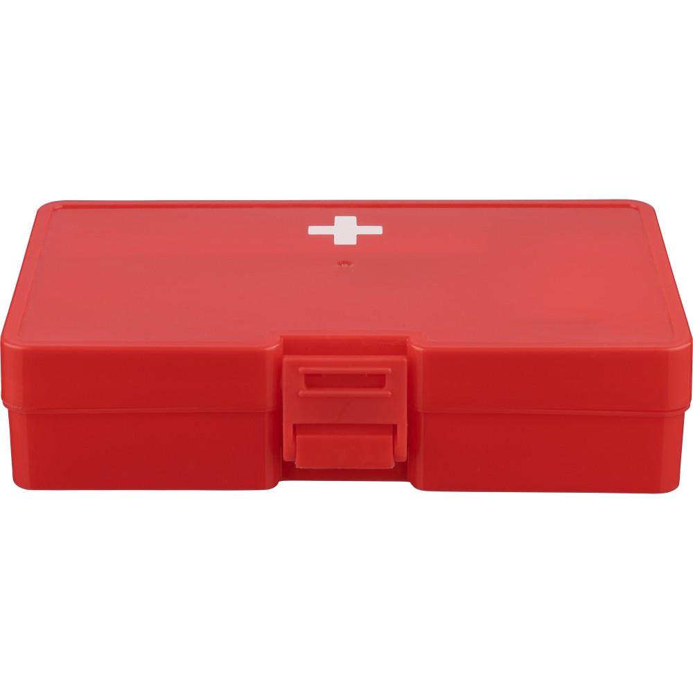 PP anyagból készült elsősegélykészlet piros tokban, a felső részen fehér kereszttel és csatos záródással. Tartalma: 2 nemszőtt törlőkendő, 5 ragtapasz, 4 alkoholos törlőkendő, 1 olló, 1 tekercs 450 cm hosszú gézkötés és 1 tekercs 450 cm hosszú ragasztószalag.