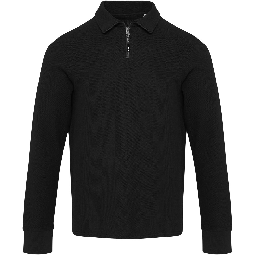 A Zeus uniszex hosszúujjú, félcipzáras felső egész évben kényelmes viseletet biztosít. Anyaga piqué kötésű, amely kellemes tapintású és tartós kialakítású. A kidolgozást finom pick stitch varrásrészletek egészítik ki, az azonos alapanyagból készült nyakszalag-erősítés pedig hozzájárul a hosszabb élettartamhoz. Az oldalsó sliccek, szintén saját anyagból készült betétekkel, nagyobb mozgásszabadságot tesznek lehetővé. A hőtranszferes márkajelzés cimkementes komfortot nyújt. A termék AWARE nyomonkövetesi technológiával van ellátva, amely egy digitális termékútlevelet tartalmaz, igy biztosítva az átláthatóságot és a fenntarthatósági jellemzők bemutatását. 100% pamut, 245 g/m2.