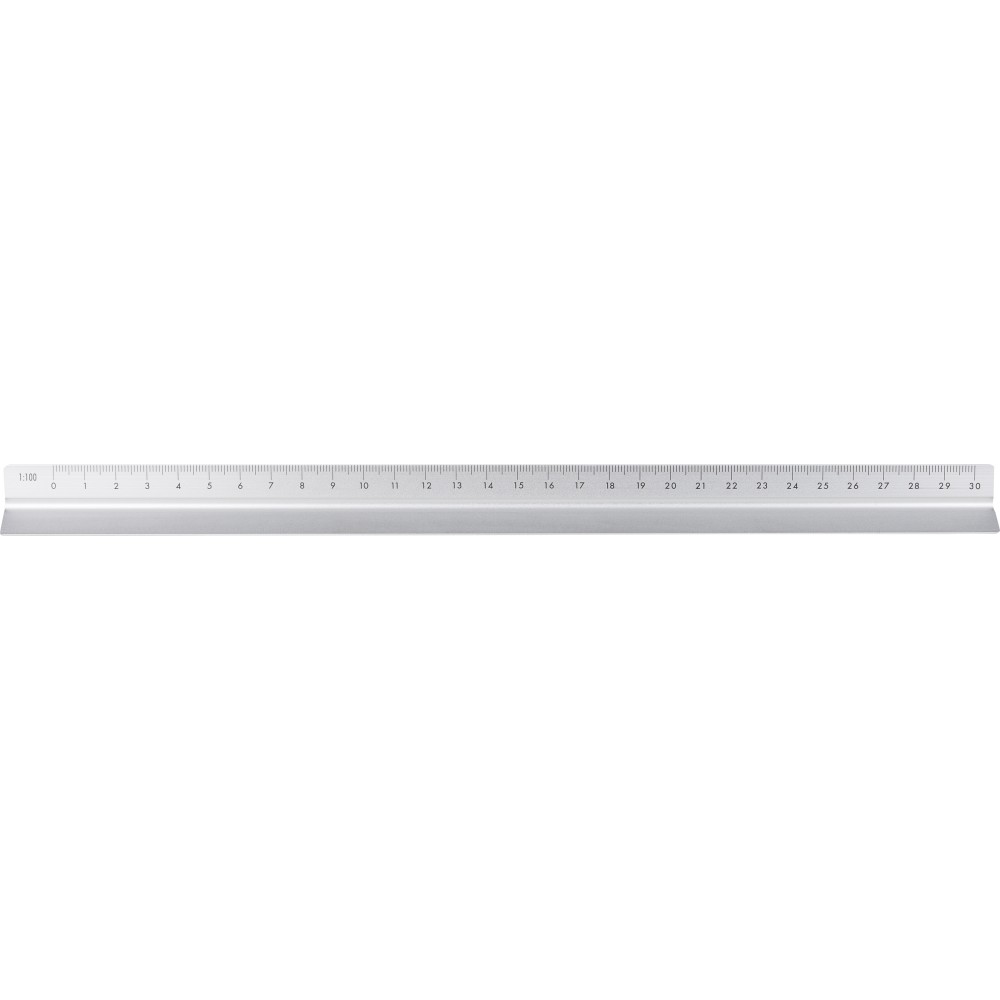 Alumíniumból készült, 30 cm hosszú háromszög alakú vonalzó több mérési léptékkel: 1:20, 1:25, 1:50, 1:75 és 1:100. Az egyik oldala skála nélküli gravírozási felületként használható. Centiméter és inch beosztással ellátva. Darabonként barna kartondobozba csomagolva.