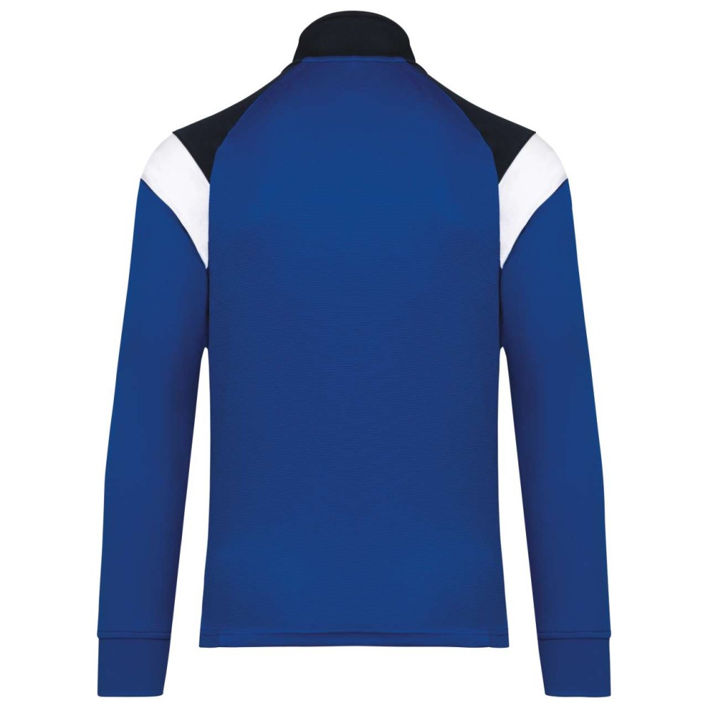 Anyaga: 100% matt poliészter interlock. Egyenes szabás. Elöl fordított cipzáras záródás színazonos nejlonból. Raglán ujjak kontrasztos vállbetétekkel. Kontrasztos mell- és vállkialakítás. Két cipzáras elülső zseb. Texturált anyagbetétek az oldalakon és a hátrészen. Cipzárfedő a felső nyakkivágásnál a nagyobb kényelem érdekében. Könnyen eltávolítható márkajelzés a dekorációhoz.