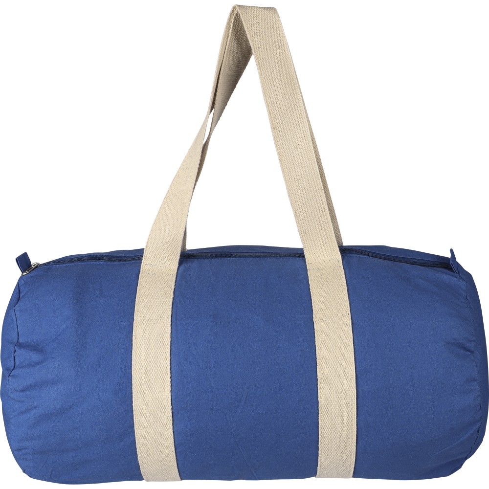 Oeko-Tex minősítésű, 180 g/m2 pamutból készült színes, cipzáras sporttáska 60 cm hosszúságú és 5 cm szélességű natúr pamutfülekkel. Oeko-Tex címkével ellátva.